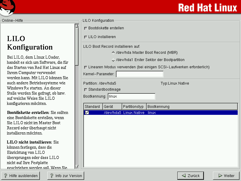 Um Ihr Red Hat Linux System starten zu können, müssen Sie gewöhnlich LILO (LInux LOader) installieren. Dies ist an zwei Stellen möglich: