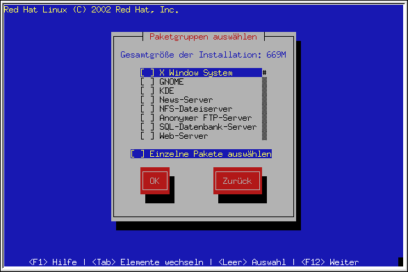 Einige Pakete (wie zum Beispiel der Kernel und bestimmte Bibliotheken) sind für jedes Red Hat Linux System erforderlich und können nicht selektiert oder deselektiert werden. Diese Pakete sind bereits standardmäßig ausgewählt. |