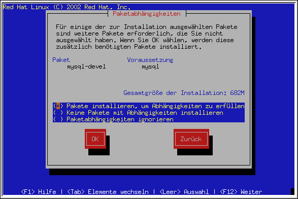 Viele der Software-Pakete können nur in Verbindung mit anderen Software-Paketen, die im System installiert sein müssen, korrekt ausgeführt werden. So benötigen beispielsweise viele der grafischen Tools zur Systemadministration für das Red Hat Linux System die Pakete python und pythonlib. Um sicherzugehen, dass alle Pakete zur Verfügung stehen, die Ihr System benötigt, überprüft Red Hat Linux diese Abhängigkeiten bei jeder Installation oder Deinstallation von Software-Paketen.