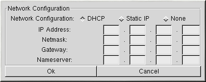 In the Additional Options section, click the Networking button to configure the network settings. Choose DHCP, Static IP, or None as shown in Figure 2-2. If you choose Static IP, enter your IP address, netmask, gateway, and primary nameserver in the given text fields.