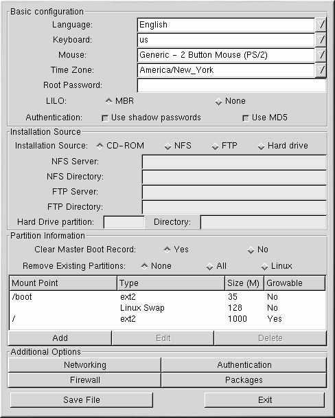 All options in the Basic Configuration section are required. Choose the default language, keyboard, mouse, and time zone. Enter a root password in the Root Password text field to set the root password for the system. Choose whether to install LILO on the master boot record (MBR) or not to install LILO. Next to Authentication choose whether to enable shadow passwords and MD5.