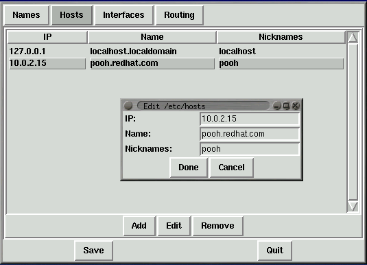 En el panel de gestión de Hosts, puede añadir, modificar o suprimir hosts desde el archivo /etc/hosts file. Añadir o modificar una entrada implica acciones idénticas. Aparecerá una ventana de diálogo. Escriba la nueva información y haga click en Done cuando acabe. Vea como ejemplo el Figura 15-3.