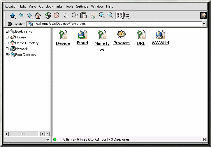 Mime Type — Crea un enlace con una aplicación o un fichero de texto. (MIME significa Multipurpose Internet Mail Extensions; son utilizados para describir tipos de datos distintos de forma que el sistema operativo sepa como trabajar con ellos en caso de que se seleccione un fichero de la misma clase de datos). No utilizará a menudo estos templates, puesto que muchos tipos MIME se proporcionan con KDE.