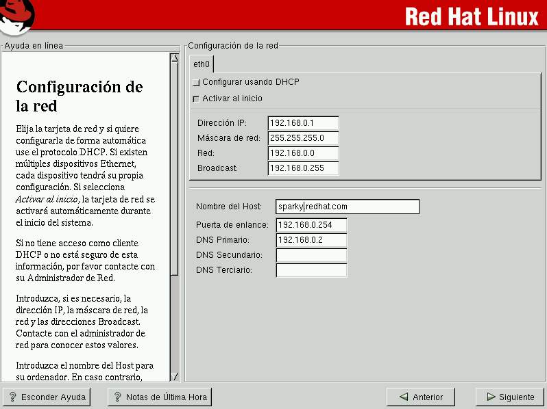 Elija este método para configurar la dirección IP usando DHCP (Dynamic Host Configuration Protocol). Si selecciona Activar al inicio, su interfaz de red se iniciará al arrancar el sistema. Si no tiene acceso cliente a DHCP o no está seguro, contacte con su administrador de sistemas.