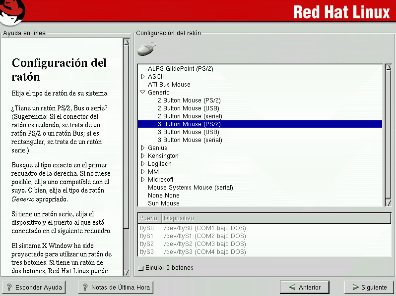 La casilla de verificación Emular 3 Botones le permite simular el funcionamiento de un ratón de tres botones si tiene uno de dos. Si selecciona esta casilla de verificación, podrá emular un tercer botón, el que se encontraría en el medio, presionando simultáneamente ambos botones disponibles en su ratón de dos botones. En general, es más fácil usar el Sistema X Window si dispone de un ratón de 3 botones.