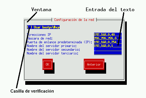 El programa de instalación en modo texto de Red Hat Linux utiliza una interfaz con soporte para ventanas que incluye la mayoría de los "widgets" de ventana que habitualmente se encuentran en las interfaces gráficas de usuario. El Figura 5-3 y el Figura 5-4 ilustran un ejemplo de las ventanas que se encontrará.