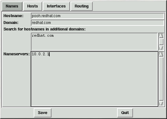 La fenêtre Names de Network Configurator a deux fonctions principales : définir le nom d'hôte et le domaine de l'ordinateur et déterminer quel serveur de noms sera utilisé pour rechercher d'autres hôtes sur le réseau. La fenêtre Names ne peut pas configurer un ordinateur pour qu'il devienne un serveur de noms. Pour modifier un champ ou y ajouter de l'information, cliquez simplement sur le champ en question à l'aide du bouton gauche de la souris et entrez l'information.