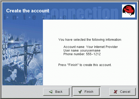 Si vous êtes satisfait des entrées, cliquez sur Finish pour créer le compte ; si vous voulez modifier les informations, cliquez sur le bouton Back pour revenir à l'écran précédent.