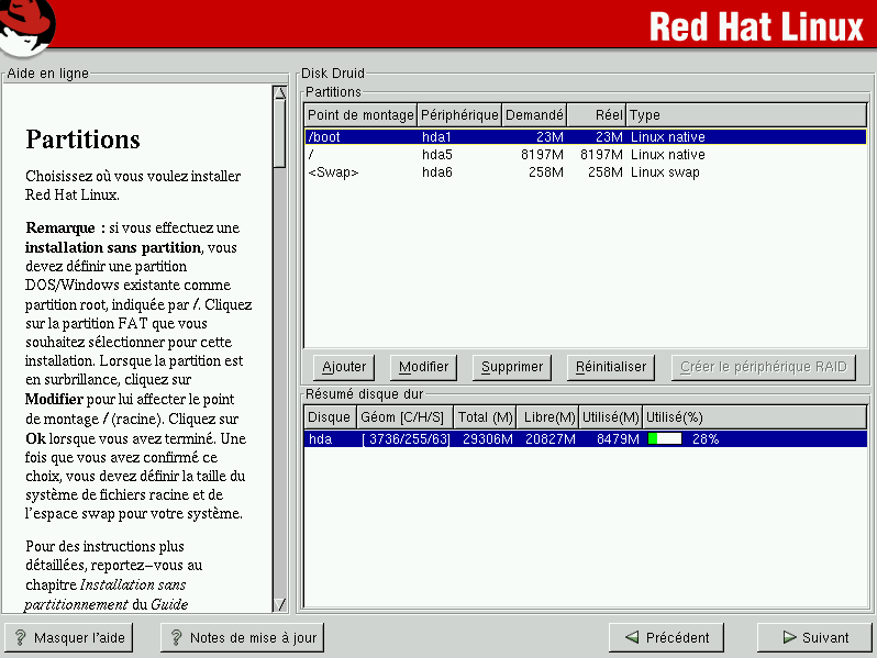 Si vous n'avez pas encore défini la configuration des partitions, reportez-vous à l'annexe du Guide de référence officiel Red Hat Linux. Vous avez besoin au minimum d'une partition root de taille adéquate et d'une partition swap de 32 Mo.