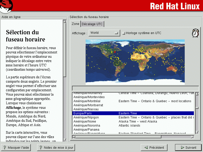 Pour modifier la configuration du fuseau horaire après avoir démarré votre système Red Hat Linux, devenez root et utilisez la commande /usr/sbin/timeconfig.
