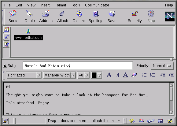 Potete trascinare i file dal vostro desktop o dal file manager allo stesso modo in cui trascinate gli URL da Navigator. Dovete solo premere il tasto del mouse sul file che volete allegare e trascinarlo nel campo degli allegati. |