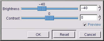 Ora è necessario scurire solo l'area selezionata. Il filtro Bump Map interagisce con le impronte e con il resto del bordo. GIMP fornisce un certo numero di metodi per scurire l'area selezionata. Fate clic con il tasto destro sull'immagine, quindi selezionate Image => Colors => Brightness-Contrast e il valore Brightness viene portato a -40, come visualizzato nella Figura 9-20.