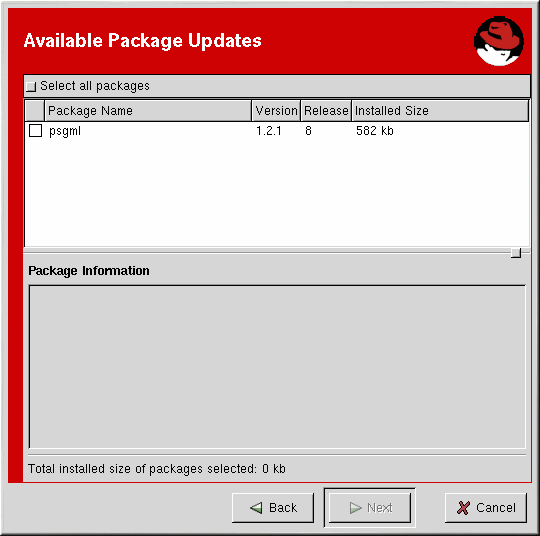 Dopo aver avviato l' Red Hat Update Agent, compare la schermata che visualizza i nuovi pacchetti disponibili per il vostro sistema. Potrebbero passare alcuni minuti prima che compaia questa schermata.
