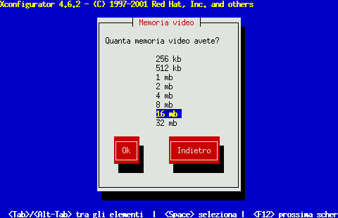 Se non siete sicuri della quantità di memoria della vostra scheda consultate la documentazione che accompagna la scheda video. Scegliendo più memoria di quella presente sulla scheda, non la danneggerete, ma potreste causare un malfunzionamento del server XFree86.