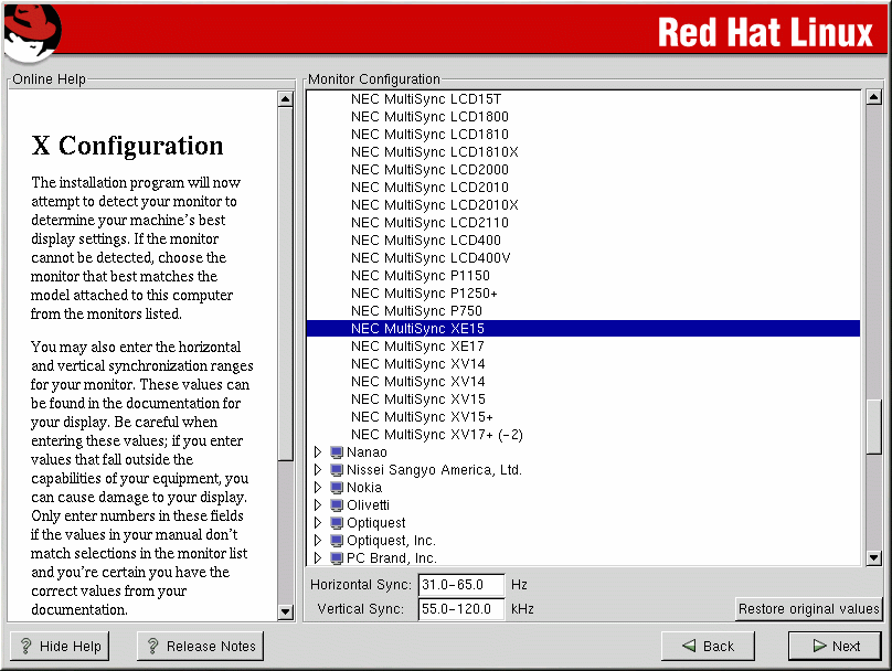 Xconfigurator, the X Window System configuration tool, presents a list of monitors for you to choose from. In the list, you can either use the monitor that is autodetected for you, or choose another monitor.