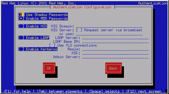 Unless you are setting up NIS authentication, you will notice that only MD5 and shadow passwords are selected (see Figure 3-20). We recommend you use both to make your machine as secure as possible.
