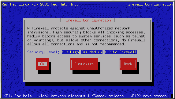 No firewall provides complete access to your system and does no security checking. Security checking is the disabling of access to certain services. It is recommended that this only be selected if you are running on a trusted network (not the Internet), or if you plan to do more detailed firewall configuration later.