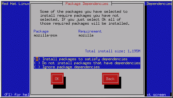 Many software packages, in order to work correctly, depend on other software packages that must be installed on your system. For example, many of the graphical Red Hat system administration tools require the python and pythonlib packages. To make sure your system has all the packages it needs in order to be fully functional, Red Hat Linux checks these package dependencies each time you install or remove software packages.
