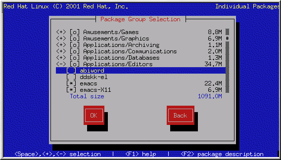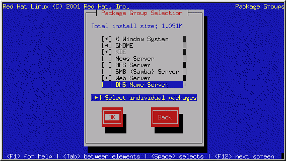 Select each component you wish to install. Selecting Everything (at the end of the component list) during a custom-class installation installs all packages included with Red Hat Linux. If you select every package, you will need approximately 1.7 GB of free disk space.
