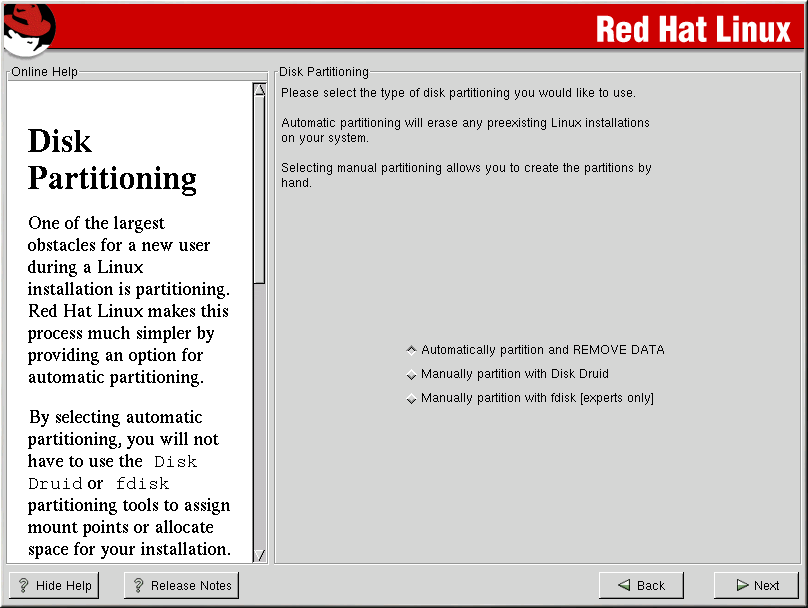 In this screen, you can choose to perform automatic partitioning, to partition manually using Disk Druid, to partition manually using fdisk, or use the Back button to choose a different installation method (see Figure 4-5).