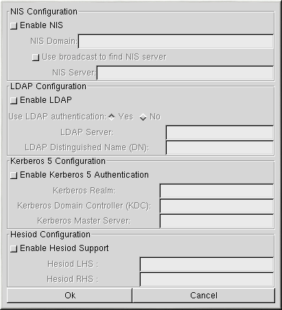Klicken Sie auf die Schaltfläche Authentication, um NIS, LDAP, Kerberos 5 und den Hesiod-Support zu aktivieren. Es erscheint das in Abbildung 2-3 gezeigte Fenster.