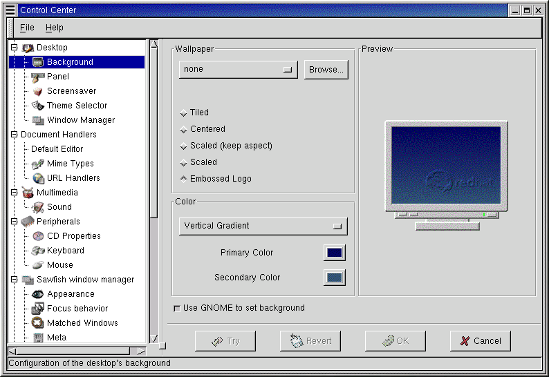 Deaktivieren Sie schließlich noch die Option Use GNOME to set background , wenn Sie den Hintergrund auf andere Weise einstellen wollen (beispielsweise mit dem Konfigurationsprogramm Ihres Windowmanagers).