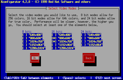 Sie können Modi von 8-Bit bis 24-Bit auswählen, wobei sich Ihre Auswahl nach der Leistungsfähigkeit Ihrer Grafikkarte und der gewünschten Farbanzahl richten sollte. In jeder Spalte für die Grafikmodi finden Sie verschiedene Optionen für Auflösungen, die Sie mit der Tabulatortaste auswählen können. Sobald sich der Cursor neben der ausgewählten Auflösung befindet, können Sie diese Auflösung durch Drücken der Leertaste auswählen.