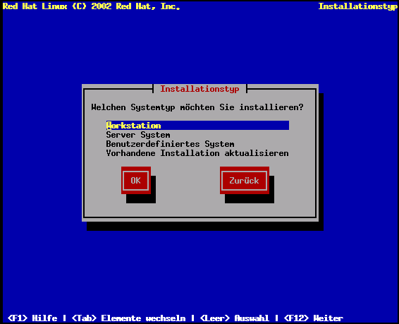 Red Hat Linux gibt Ihnen die Möglichkeit, den für Sie am besten geeigneten Installationstyp auszuwählen. Als Optionen stehen Workstation, Server oder Benutzerdefiniert zur Verfügung.