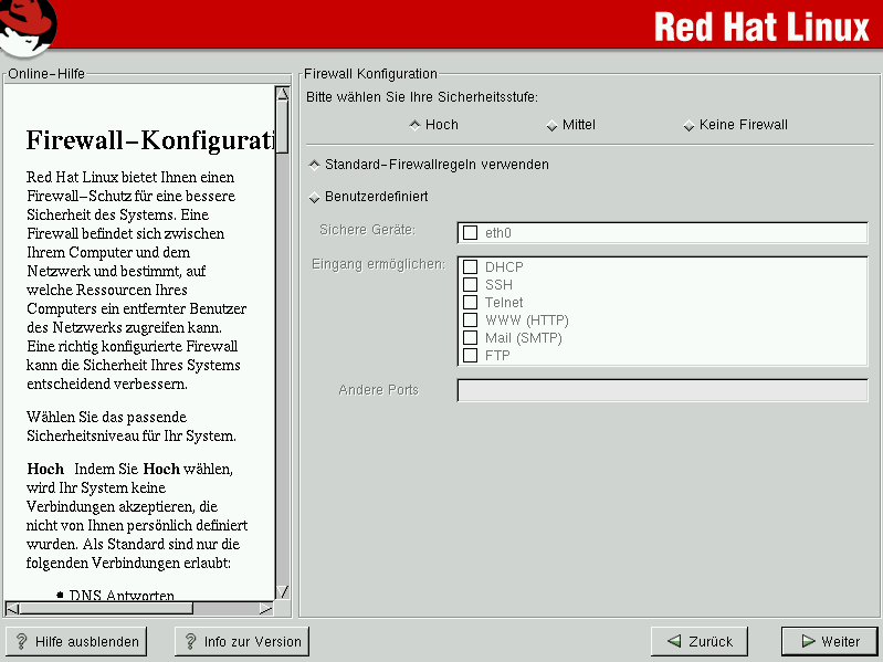 Red Hat Linux bietet einen Firewall-Schutz als weitere Sicherheit für Ihr System. Die Firewall befindet sich zwischen Ihrem Computer und dem Netzwerk und bestimmt, auf welche Ressourcen Ihres Computers Remote-Benutzer des Netzwerks zugreifen können. Eine richtig eingestellte Firewall kann die Sicherheit Ihres Systems erheblich verbessern.