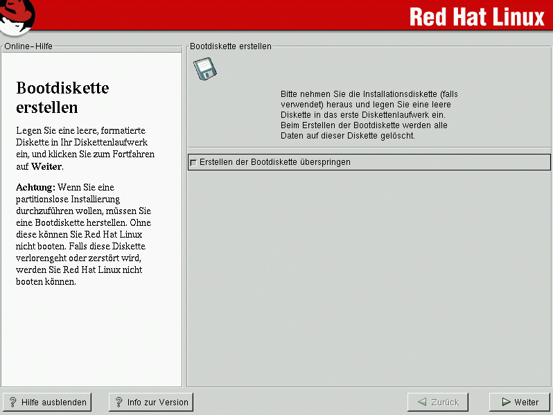 Wenn Sie eine partitionslose Installation ausführen, müssen Sie eine Bootdiskette erstellen. Ohne diese Diskette ist es nicht möglich, Red Hat Linux zu booten. Das gleiche gilt, wenn die Bootdiskette verlorengeht oder beschädigt wird.