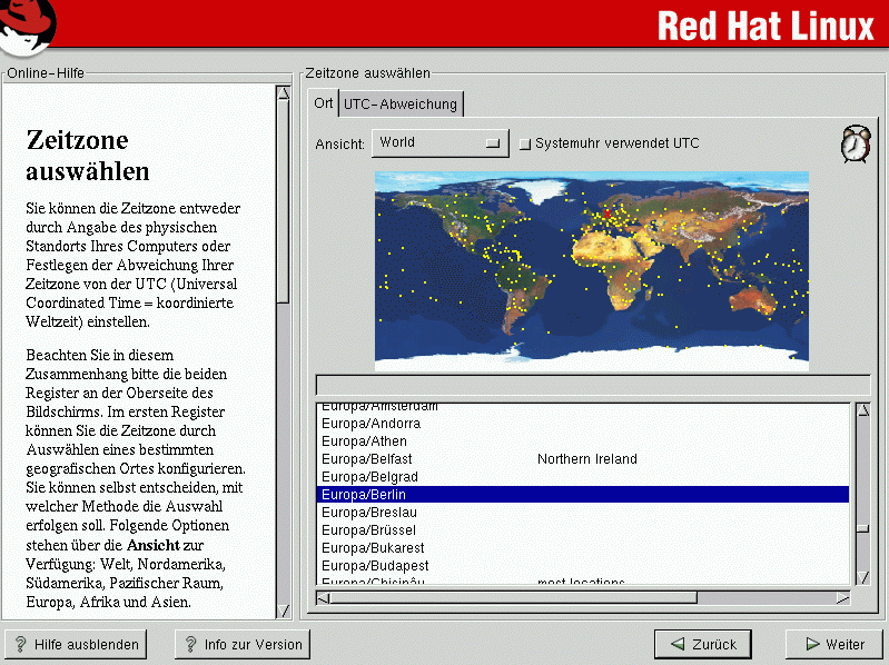 Wenn Sie die Konfiguration Ihrer Zeitzone ändern möchten, nachdem Sie Red Hat Linux gebootet haben, melden Sie sich als Root an und verwenden Sie den Befehl /usr/sbin/timeconfig.