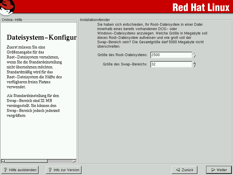 Der Swap-Bereich dient als virtueller Speicher. Das bedeutet, dass die Daten in eine Swap-Partition geschrieben werden, wenn nicht ausreichend RAM zum Speichern der Daten vorhanden ist, die Ihr System gerade verarbeitet. Das Installationsprogramm richtet standardmäßig einen Swap-Bereich von 32 MB ein. Sie können die Größe dieses Bereichs jedoch beliebig vergrößern, auch wenn es nicht sinnvoll ist, für den Swap-Bereich mehr als 256 MB zur Verfügung zu stellen.