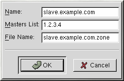 To add a slave zone (also known as a secondary master), click the Add button and select Slave Zone. Enter the domain name for the slave zone in the Domain name text area.