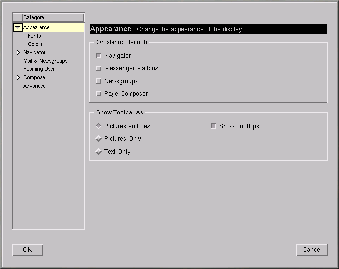 • Mail & Newsgroups — Settings for using Communicator's email and news clients. To learn how to use these settings, turn to the section called Email and News Settings for Messenger.