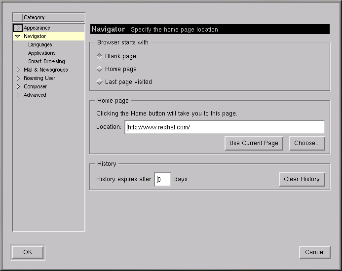 • Navigator — Among other things, lets you specify your home page, or the page you see when the browser starts. Also allows you to modify how long to keep previously visited sites in a history, for quick viewing later.