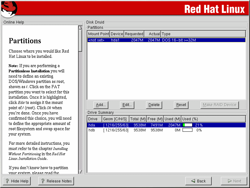 Since you will not be adding partitions or creating new partitions, you do not need to do much with Disk Druid (a GUI partitioning tool).
