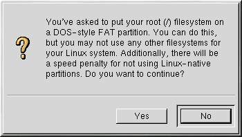 A confirmation window (see Figure B-3) appears next, asking you to confirm that you want to continue with this installation. It explains that you cannot have any Linux partitions on your system other than the / labeled DOS partition you have just created. Click Yes to continue.