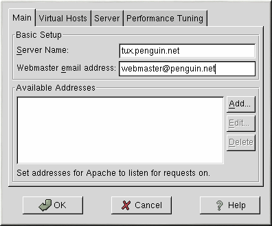 L'outil de configuration d'Apache vous permet de configurer le fichier de configuration /etc/httpd/conf/httpd.conf pour votre serveur Web Apache. Celui-ci n'utilise pas les anciens fichiers de configuration srm.conf ou access.conf, alors laissez-les vides. L'interface graphique vous permet de configurer des directives, telles que des hôtes virtuels, des attributs de connexion et le nombre maximum de connexions.