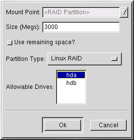 Si vous faites de /boot une partition RAID, vous devez choisir RAID level 1 et il doit utiliser l'un des deux premiers disques (d'abord IDE, puis SCSI). Si vous ne faites pas de /boot une partition RAID et que vous faites de / une partition RAID, vous devez être RAID level 1, et il doit utiliser l'un des deux premiers disques (d'abord IDE, puis SCSI). |