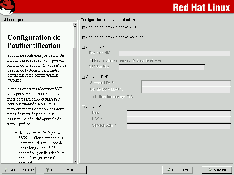 Activation de Kerberos — Kerberos est un système sécurisé qui fournit des services d'authentification par réseau. Pour plus d'informations, reportez-vous au chapitre Utiliser Kerberos 5 sur Red Hat Linux du Guide de référence officiel Red Hat Linux. A ce niveau, vous pouvez choisir entre trois options :
