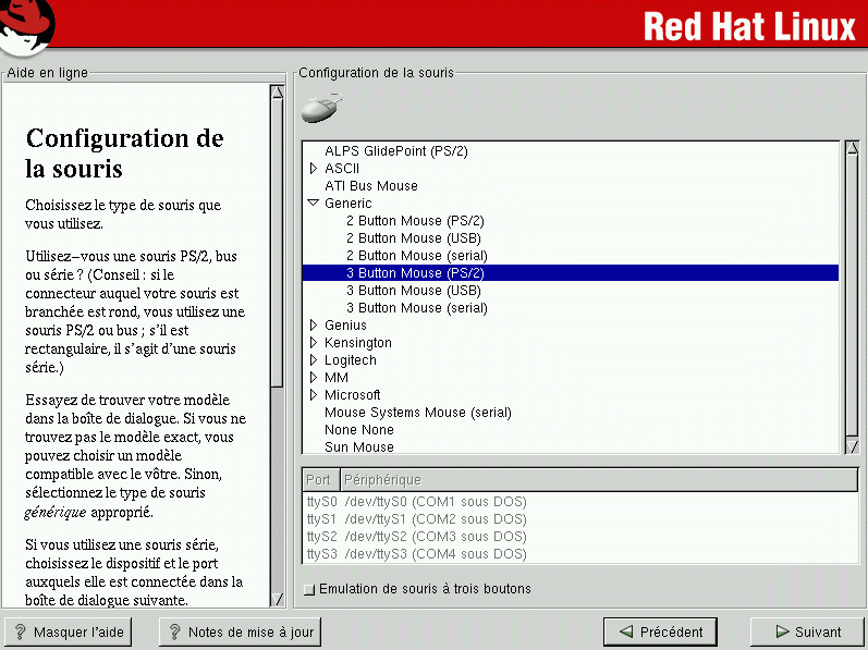 Si vous disposez d'une souris PS/2 ou Bus, il est inutile de sélectionner un port et un périphérique. Si vous disposez d'une souris série, sélectionnez soigneusement le périphérique auquel elle est connectée.