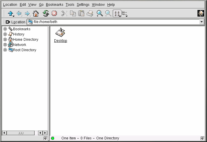 Quando la finestra della vostra home directory si apre, compare una finestra simile a quella presentata nella Figura 11-6. Per default, la finestra contiene le icone e i collegamenti associati ai file presenti sul sistema. Potete cambiare questa visualizzazione entrando nel menu View.