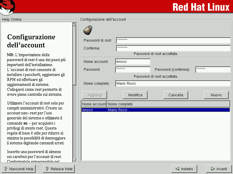 La configurazione di un account e una password di root rappresenta uno dei passi più importanti durante l'installazione. L'account di root è simile all'account dell'amministratore usato negli elaboratori con Windows NT. L'account di root è utilizzato per installare pacchetti, aggiornare gli RPM ed eseguire la manutenzione del sistema. Collegarsi come root può darvi un pieno controllo del sistema.