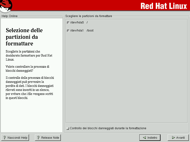 | Indietro | Capitolo 4. Installazione di Red Hat Linux | Avanti |