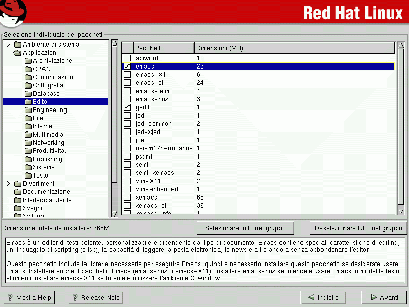 Alcuni pacchetti (per esempio il kernel e alcune librerie) sono richiesti dal sistema Red Hat Linux e non possono essere né selezionati né deselezionati. Tali pacchetti sono selezionati per default.
