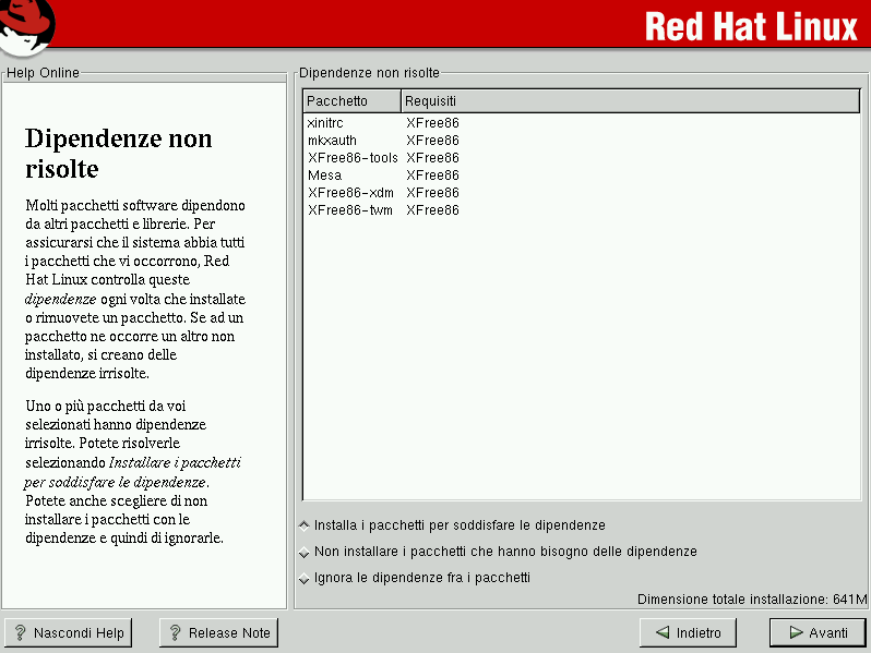 La schermata Dipendenze non risolte compare solo se alcuni pacchetti richiesti da altri non sono presenti. Sotto l'elenco dei pacchetti mancanti, la casella Installa i pacchetti per soddisfare le dipendenze è selezionata per default. Se non la deselezionate, il programma di installazione risolve automaticamente le dipendenze aggiungendo all'elenco dei pacchetti selezionati tutti i pacchetti richiesti.