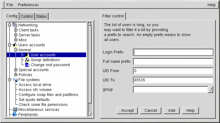 Öffnen Sie Config => Users accounts => Normal => User accounts. Linuxconf zeigt Ihnen moglicherweise einen Filterbildschirm an (siehe Abbildung 14-2).