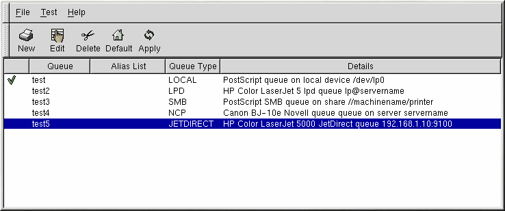 Klicken Sie nun auf den Button OK. Der neue Drucker erscheint jetzt in der Druckerliste im Hauptfenster. Klicken Sie im Hauptfenster auf den Button Apply, um Ihre Änderungen in der Konfigurationsdatei /etc/printcap zu speichern und starten Sie den Drucker- Dämon (lpd) neu. Nachdem die Änderungen eingerichtet sind, drucken Sie eine Testseite, um sicherzustellen, dass die Konfigurationen richtig sind. Unter Abschnitt namens Drucken einer Testseite finden Sie weitere Details.