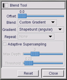 Doppelklicken Sie bei ausgewähltem rotem "Hello World!" auf das Farbverlaufstool, um es zu aktivieren und seine Tool Options anzuzeigen. Für diesen Effekt wurde Custom Gradient als Blend und Shapeburst (angular) als Gradient ausgewählt, siehe Abbildung 9-29.