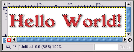 Jetzt ist der "richtige" Text hinzuzufügen. Zuerst muss die aktive Vordergrundfarbe geändert werden. Hier wurde ein blasses Rot (RGB 204 051 051) gewählt. Klicken Sie dann bei aktivem Texttool auf das Bild. Das Dialogfeld Texttool wird geöffnet. Überprüfen Sie, ob dieselben Einstellungen gewählt wurden (standardmäßig vorhanden, es sei denn, GIMP wurde geschlossen). Klicken Sie auf OK, um dem Bild den roten Text "Hello World!" hinzuzufügen, und verschieben Sie den Text in die richtige Position, siehe Abbildung 9-28.